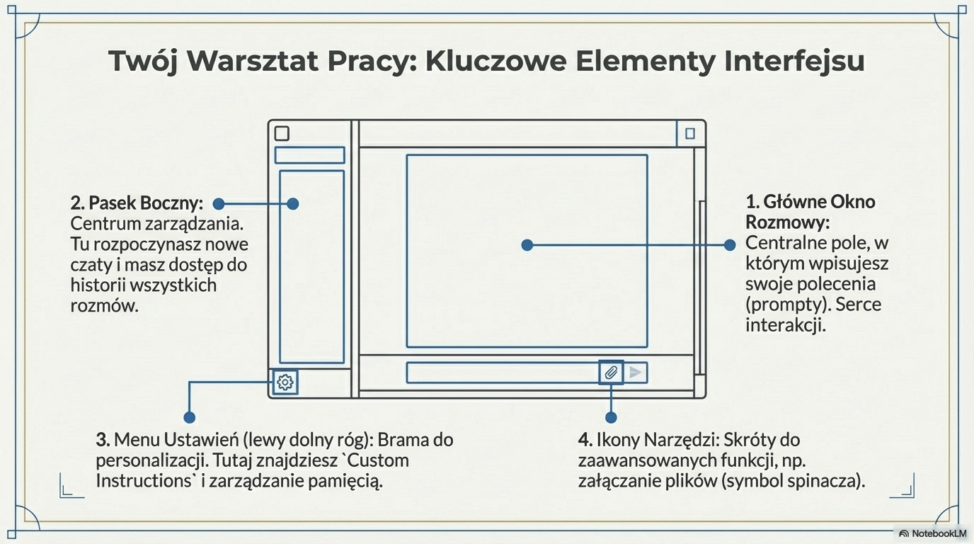 Po zalogowaniu naszym oczom ukazuje się minimalistyczny i bardzo prosty w obsłudze interfejs. Jego sercem jest główne okno rozmowy, czyli pole tekstowe na dole ekranu. To właśnie tutaj wpisujemy nasze polecenia, zwane popularnie promptami, aby rozpocząć interakcję ze sztuczną inteligencją.