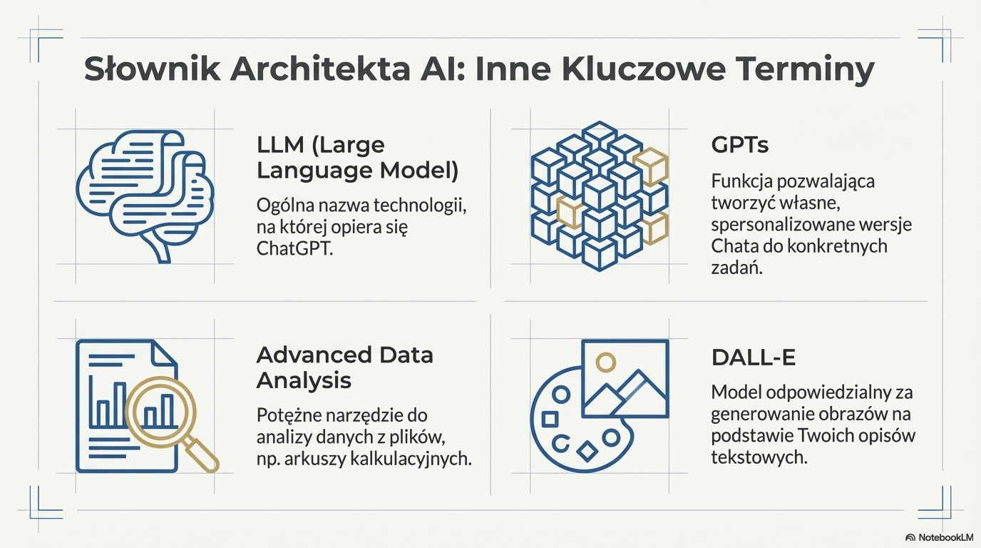 Poza powyższymi, fundamentalnymi pojęciami, warto znać kilka innych terminów, które często pojawiają się w kontekście pracy z ChatGPT. Model językowy (LLM - Large Language Model) to ogólne określenie technologii, na której opiera się ChatGPT - wytrenowanego na gigantycznych zbiorach danych systemu zdolnego do przetwarzania i generowania języka naturalnego. GPTs to funkcja pozwalająca tworzyć własne, spersonalizowane wersje Chata, wyspecjalizowane w konkretnych zadaniach poprzez dodanie własnej bazy wiedzy. Z kolei Advanced Data Analysis to potężne narzędzie do analizy danych z plików, takich jak arkusze kalkulacyjne, a DALL-E to model odpowiedzialny za generowanie obrazów na podstawie opisów tekstowych. Opanowanie tego podstawowego słownika pozwoli Ci nie tylko sprawniej komunikować się z AI, ale także lepiej rozumieć jej możliwości i śledzić dynamiczny rozwój tej fascynującej technologii.