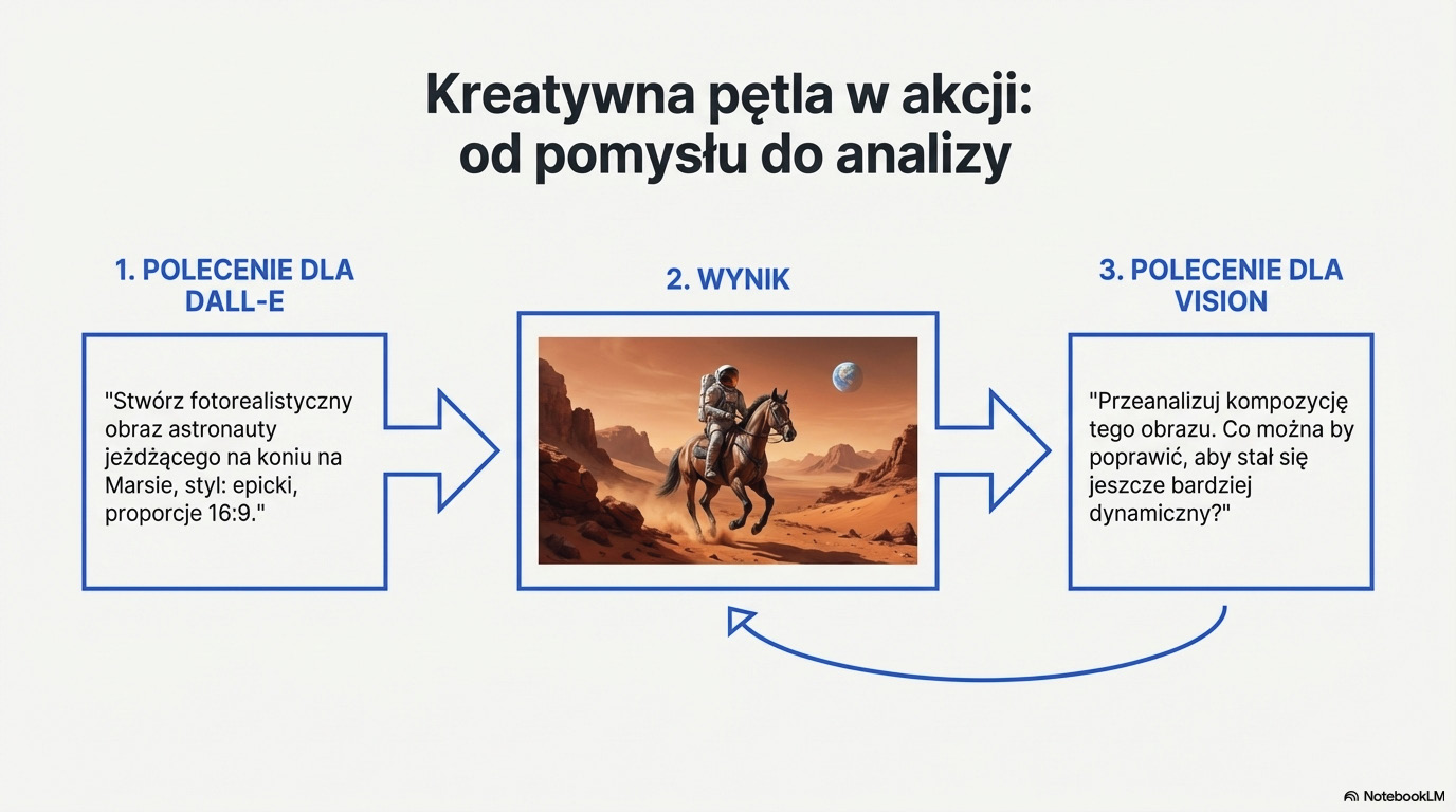 Mając te umiejętności, byliśmy gotowi, aby otworzyć zaawansowany arsenał narzędzi. Nauczyłeś się, jak wykorzystać Advanced Data Analysis do pracy z plikami i przekształcania surowych danych w cenne wnioski. Odkryłeś moc GPTs, ucząc się tworzyć własnych, spersonalizowanych asystentów, wyspecjalizowanych w konkretnych zadaniach. Poznałeś dynamiczny tryb "Kanwa" do interaktywnej pracy z tekstem oraz funkcje "Projekty" i "Zadania", które pozwalają profesjonalnie organizować i automatyzować pracę. Wreszcie, uwolniłeś swoją kreatywność, generując obrazy z DALL-E i analizując je za pomocą funkcji Vision.