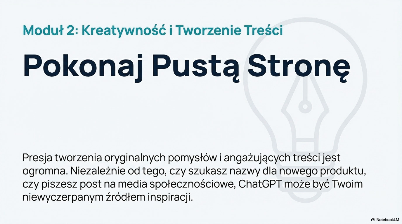 Zakres tego ebooka został starannie zaprojektowany, aby zapewnić płynne i logiczne przejście przez wszystkie etapy nauki. Rozpoczniemy od absolutnych fundamentów, tłumacząc, czym jest generatywna AI, jak poruszać się po interfejsie i jak spersonalizować narzędzie pod własne potrzeby. Następnie zagłębimy się w serce efektywnej komunikacji z maszyną - sztukę tworzenia precyzyjnych poleceń, czyli tak zwanego promptowania. Poznasz uniwersalną strukturę idealnego polecenia oraz kluczowe techniki, które pozwolą Ci uzyskiwać dokładnie takie odpowiedzi, jakich oczekujesz.