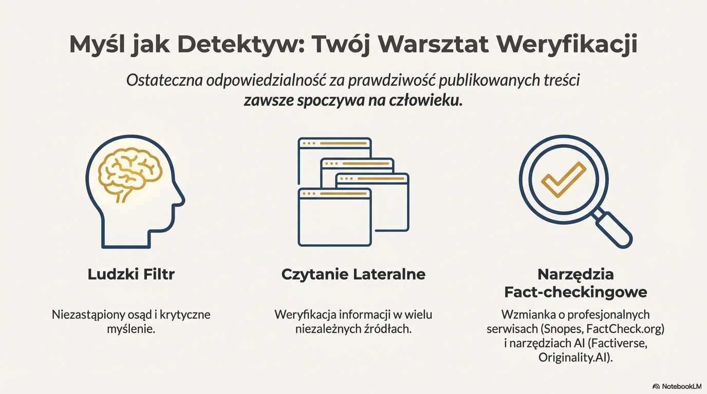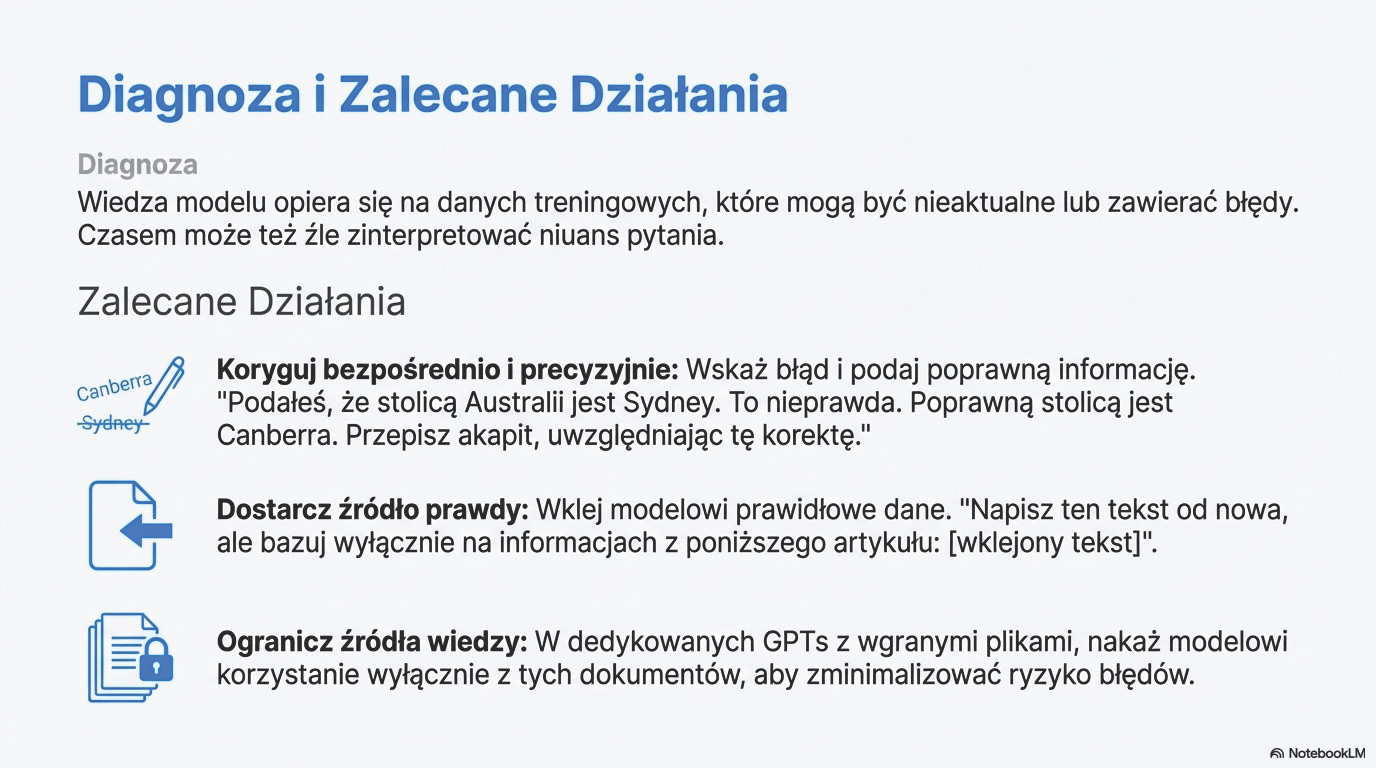 Zrozumienie zjawiska halucynacji jest absolutnie kluczowe dla zachowania krytycznego myślenia. Nigdy nie należy bezgranicznie ufać informacjom generowanym przez AI, zwłaszcza gdy dotyczą one specjalistycznych, niszowych dziedzin lub danych, które wymagają precyzyjnej weryfikacji. Zawsze warto sprawdzać kluczowe fakty w niezależnych, zaufanych źródłach. Istnieją metody na ograniczanie tego zjawiska, takie jak proszenie o podanie źródeł czy stosowanie w poleceniach fraz nakazujących modelowi szczerość, jednak żadna z nich nie daje stuprocentowej gwarancji.