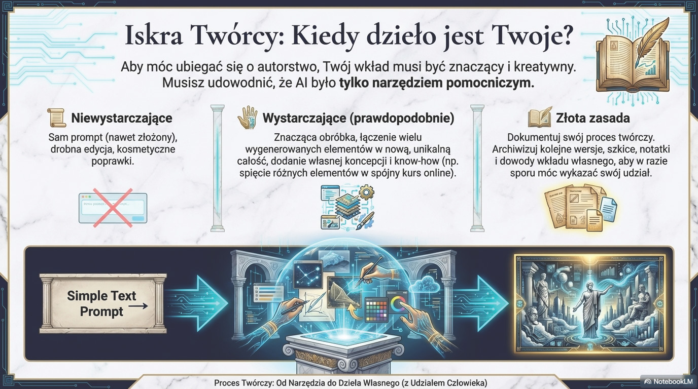Powstaje zatem pytanie, jaki poziom wkładu własnego człowieka jest wymagany, aby dzieło stworzone przy pomocy AI mogło zostać uznane za chroniony utwór. Odpowiedź zależy od konkretnego przypadku, jednak kluczowe jest wykazanie znaczącego, kreatywnego wkładu ludzkiego, który nadaje ostatecznemu dziełu indywidualny charakter. Doskonałym przykładem jest tworzenie kursu online. Jeśli jego autorka, Ilona Przetacznik, wykorzystuje AI pomocniczo do generowania fragmentów tekstów, ale całość jest wynikiem jej unikalnego know-how, autorskiej struktury, nagranych materiałów wideo i finalnej edycji, to cały kurs jest chronionym utworem. To jej wkład twórczy – koncepcja, selekcja i uporządkowanie materiału – decyduje o przyznaniu ochrony. W tym kontekście należy też rozważyć status prawny "promptu", czyli polecenia wydawanego AI. Sam w sobie rzadko jest uznawany za utwór, chyba że stanowi wysoce skomplikowany i oryginalny projekt.