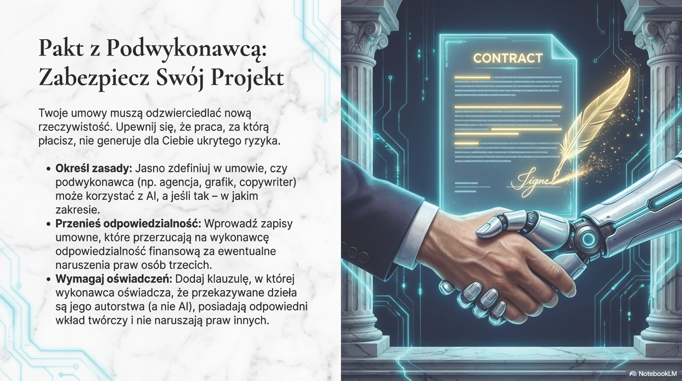 Równie istotne jest odpowiednie skonstruowanie umów z podwykonawcami, takimi jak freelancerzy czy agencje. Umowy te muszą zawierać precyzyjne klauzule, które jasno określają, czy i na jakich zasadach podwykonawca może korzystać z narzędzi AI. Kluczowe jest zawarcie zapisów, które skutecznie przenoszą odpowiedzialność za ewentualne naruszenia praw osób trzecich na podwykonawcę, oraz uzyskanie od niego formalnego oświadczenia o autorstwie i oryginalności przekazywanych dzieł. Zaniedbanie w tym obszarze prowadzi do realnych strat finansowych i wizerunkowych, co ilustruje przykład klienta, który zlecił pracę agencji, a w odpowiedzi otrzymał materiał w całości wygenerowany przez AI. Taka sytuacja natychmiast doprowadziła do utraty zaufania i odmowy zapłaty, pokazując, jak szybko nieetyczne użycie AI niszczy relacje biznesowe.