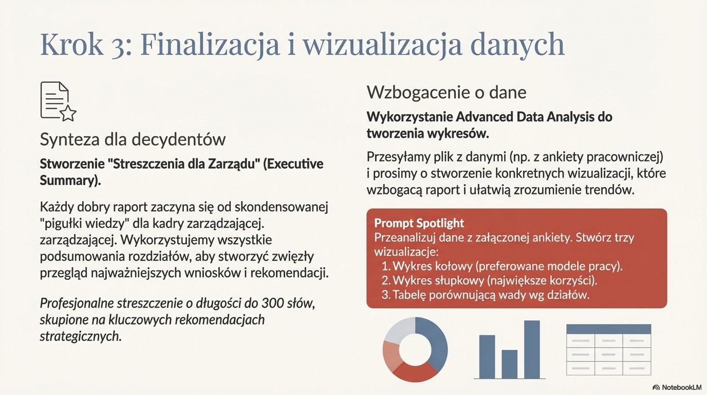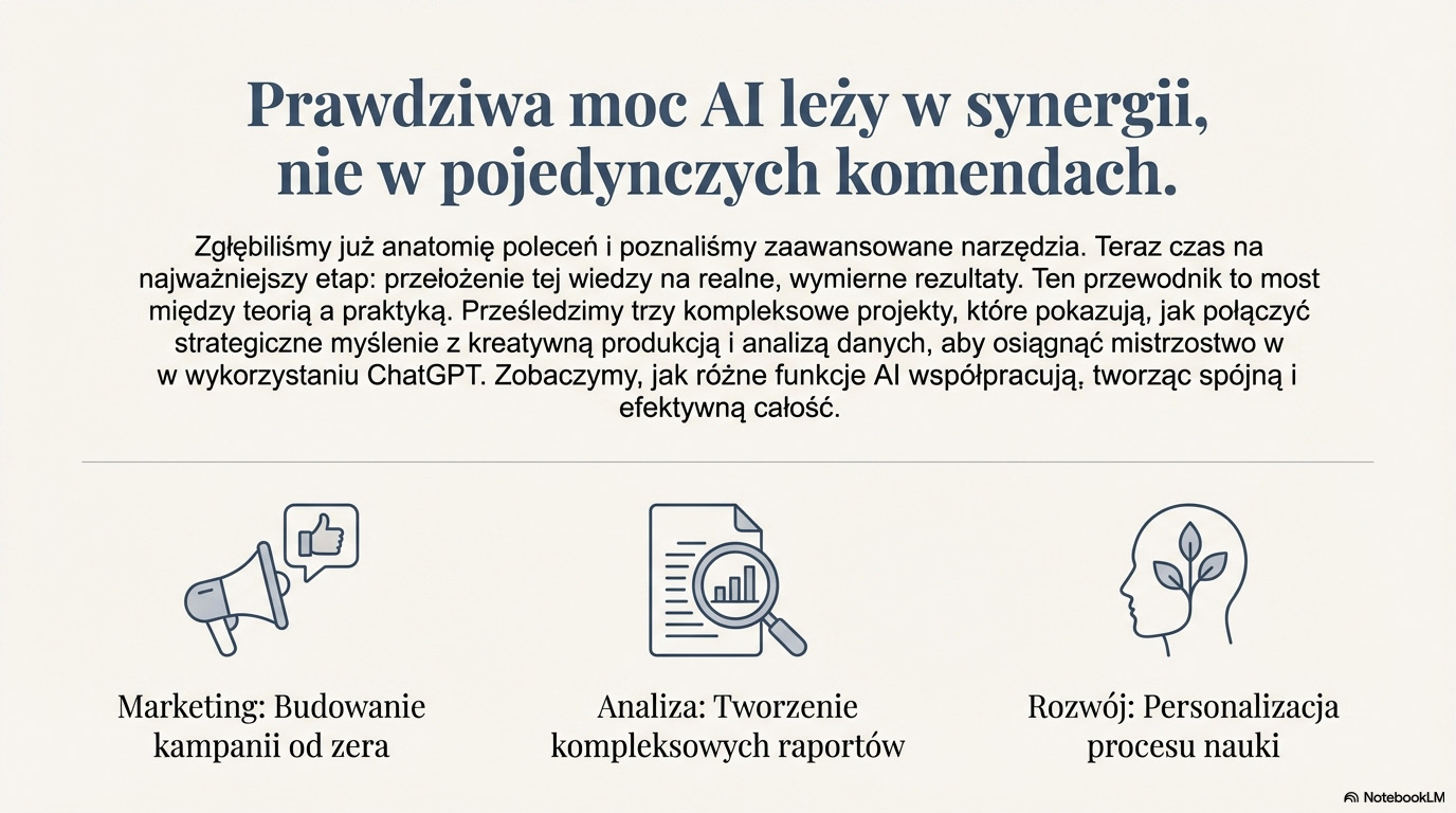 Mając te umiejętności, byliśmy gotowi, aby otworzyć zaawansowany arsenał narzędzi. Nauczyłeś się, jak wykorzystać Advanced Data Analysis do pracy z plikami i przekształcania surowych danych w cenne wnioski. Odkryłeś moc GPTs, ucząc się tworzyć własnych, spersonalizowanych asystentów, wyspecjalizowanych w konkretnych zadaniach. Poznałeś dynamiczny tryb "Kanwa" do interaktywnej pracy z tekstem oraz funkcje "Projekty" i "Zadania", które pozwalają profesjonalnie organizować i automatyzować pracę. Wreszcie, uwolniłeś swoją kreatywność, generując obrazy z DALL-E i analizując je za pomocą funkcji Vision.