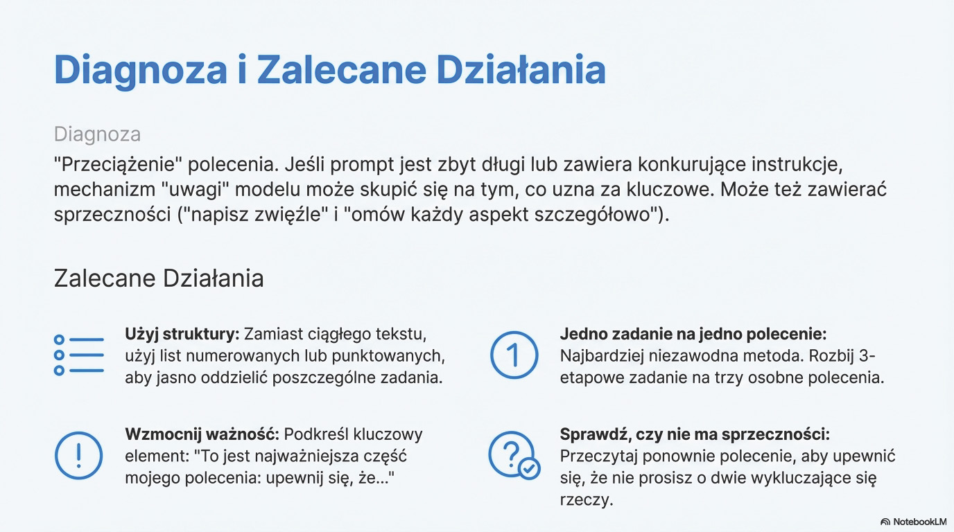 Najczęstszym błędem początkujących użytkowników jest formułowanie zbyt ogólnych poleceń. Prośba w stylu "Napisz artykuł o roślinach doniczkowych" jest dla modelu punktem wyjścia, ale pozostawia mu ogromne pole do interpretacji. Sztuczna inteligencja, nie znając naszych intencji, dostarczy tekst, który może być poprawny, ale rzadko kiedy będzie w pełni satysfakcjonujący. Technika doprecyzowania polega na świadomym dodawaniu szczegółów, które zawężają pole poszukiwań i kierują model na właściwe tory. Zamiast prosić o ogólny artykuł, możemy sprecyzować jego kluczowe atrybuty: styl ("Napisz zabawny artykuł"), długość ("o długości 3 akapitów, każdy po 4 zdania"), a także konkretne elementy, do których ma nawiązać ("Upewnij się, że w artykule nawiązujesz do monstery, paproci i kaktusa"). Każdy dodany szczegół działa jak drogowskaz, który prowadzi AI do precyzyjnie określonego celu. Im więcej konkretów dostarczymy w naszym poleceniu, tym mniejsze ryzyko, że odpowiedź nas rozczaruje, a większa szansa, że otrzymamy treść idealnie dopasowaną do naszych potrzeb. - Kontekst - jak pomóc maszynie zrozumieć Twoje intencje